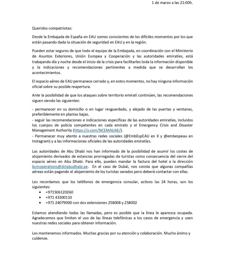 Según esta española que tabaja en Abu Dhabi, “el Gobierno ha puesto todos los medios a disposición de los pasajeros aéreos varados en el aeropuerto por el cierre del espacio aéreo. “El gobierno paga todos los hoteles tanto a los que estaban en el aeropuerto como los que hubieran volado estos días que tienen que extender su estancia aquí por la situación. Desde las 17:00 –de ayer domingo 1 de marzo- no hemos recibido otra alarma. “