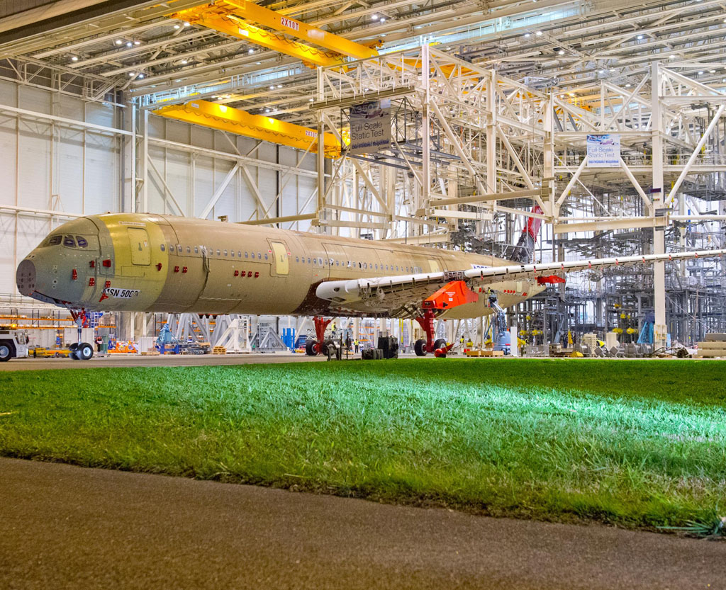 La célula de ensayos estáticos del Airbus A350 XWB ha abandonado la cadena final de montaje y pronto comenzarán los ensayos con ella.
