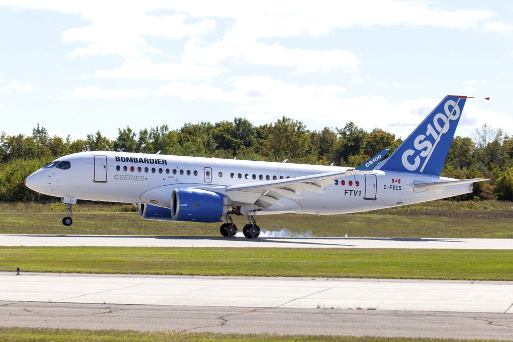 Matriculado C-FBCS y denominado FTV1 (siglas en inglés de Vehículo de Ensayos en Vuelo 1), el primer CS100 despegó a las 09:55 hora local (13:55 hora GMT) y el aterrizaje se produjo en el mismo aeropuerto de Mirabel a las 12:25 hora local (16:25 GMT).