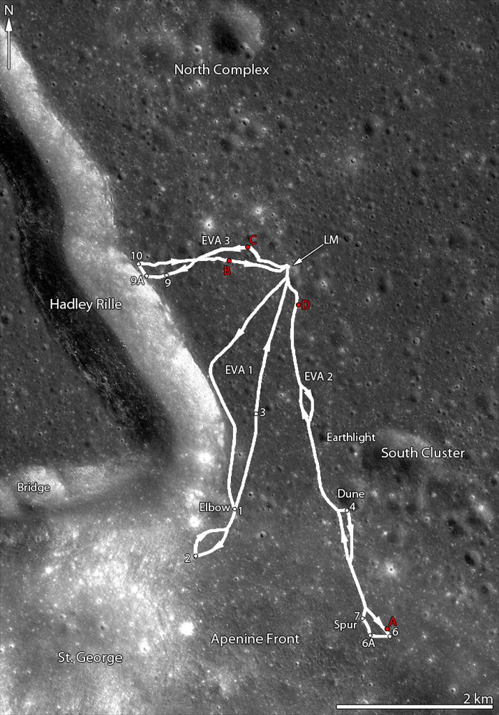 La sonda LRO (Lunar Reconnaisse Orbiter) que está fotografiando la Luna desde una altura de 25 kilómetros ha enviado una serie defotografias donde se aprecia claramente la sección inferior del módulo lunar de la misión Apollo 15, las huellas dejadas por el Lunar Rover, y este mismo, abandonado a unos 100 metros del lugar de aterrizaje.