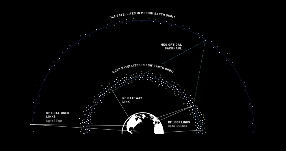 Los clientes distribuidos globalmente pueden acceder a velocidades de hasta 144 Gbps mediante enlaces de banda Q/V desde una constelación de 5.280 satélites LEO, mientras que se puede acceder a hasta 6 Tbps mediante enlaces ópticos desde 128 satélites MEO.